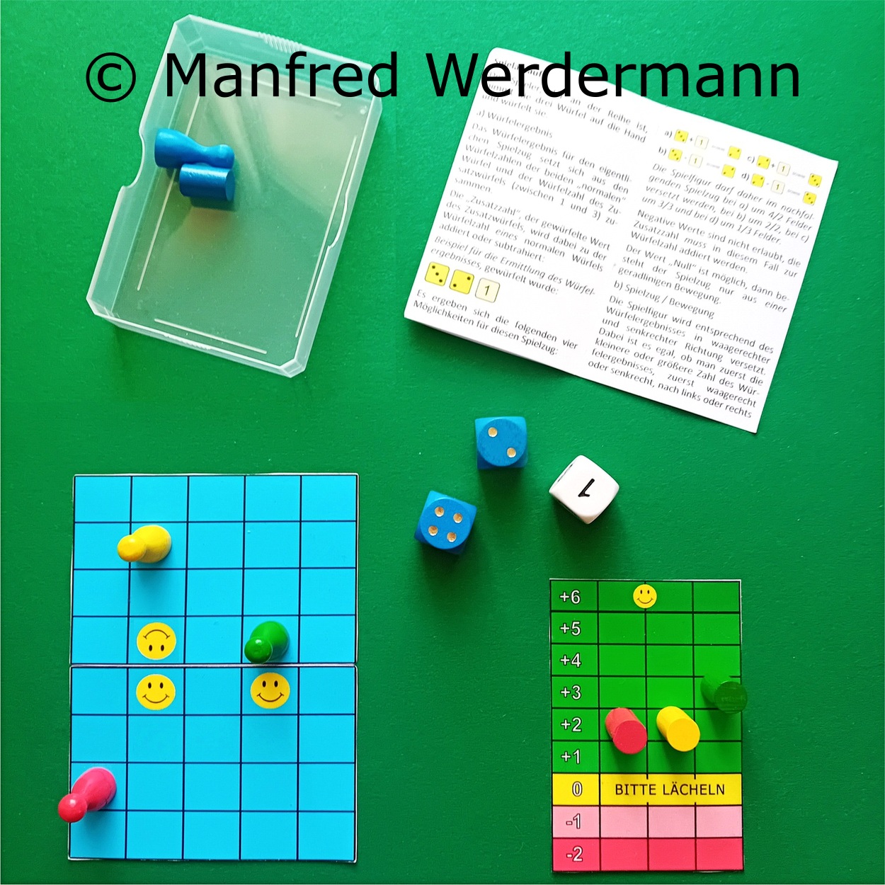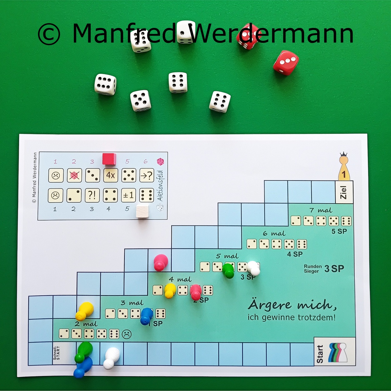 Ärgere mich,ich gewinne trotzdem!Obwohl mir meine Mitspieler den Sieg nicht gönnen und mich mit den 'Ärgerwürfeln' ärgern möchten, zeige ich ihnen, wie man mit etwas Würfelglück und taktischem Ausnutzen der Aktionsfelder trotzdem als Erster oben auf der Siegertreppe ankommt. |