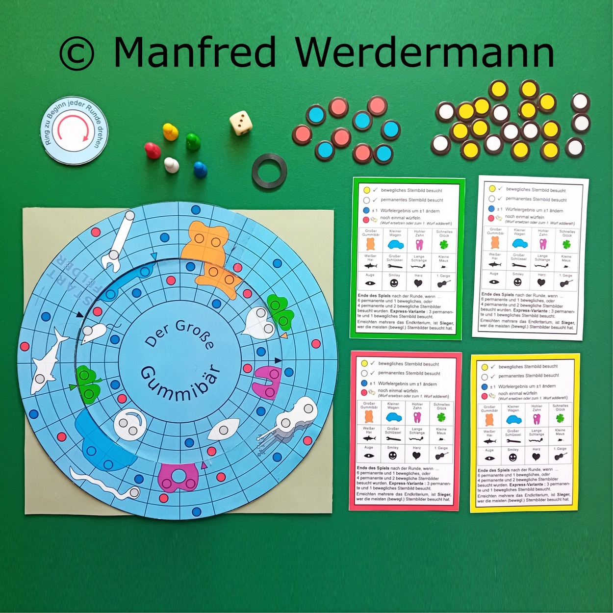 Der Große Gummibärein Familienausflug ins WeltallIn diesem sich drehenden und sich ständig verändernden Weltall gilt es, die verschiedenen Sternbilder zu besuchen. Das ist bei einigen aber gar nicht so einfach, da sie nur in gewissen Abständen vollständig am Himmel erscheinen. Und dann blockiert auch noch das 'Schwarze Loch' Sternbilder und Spielzüge. |