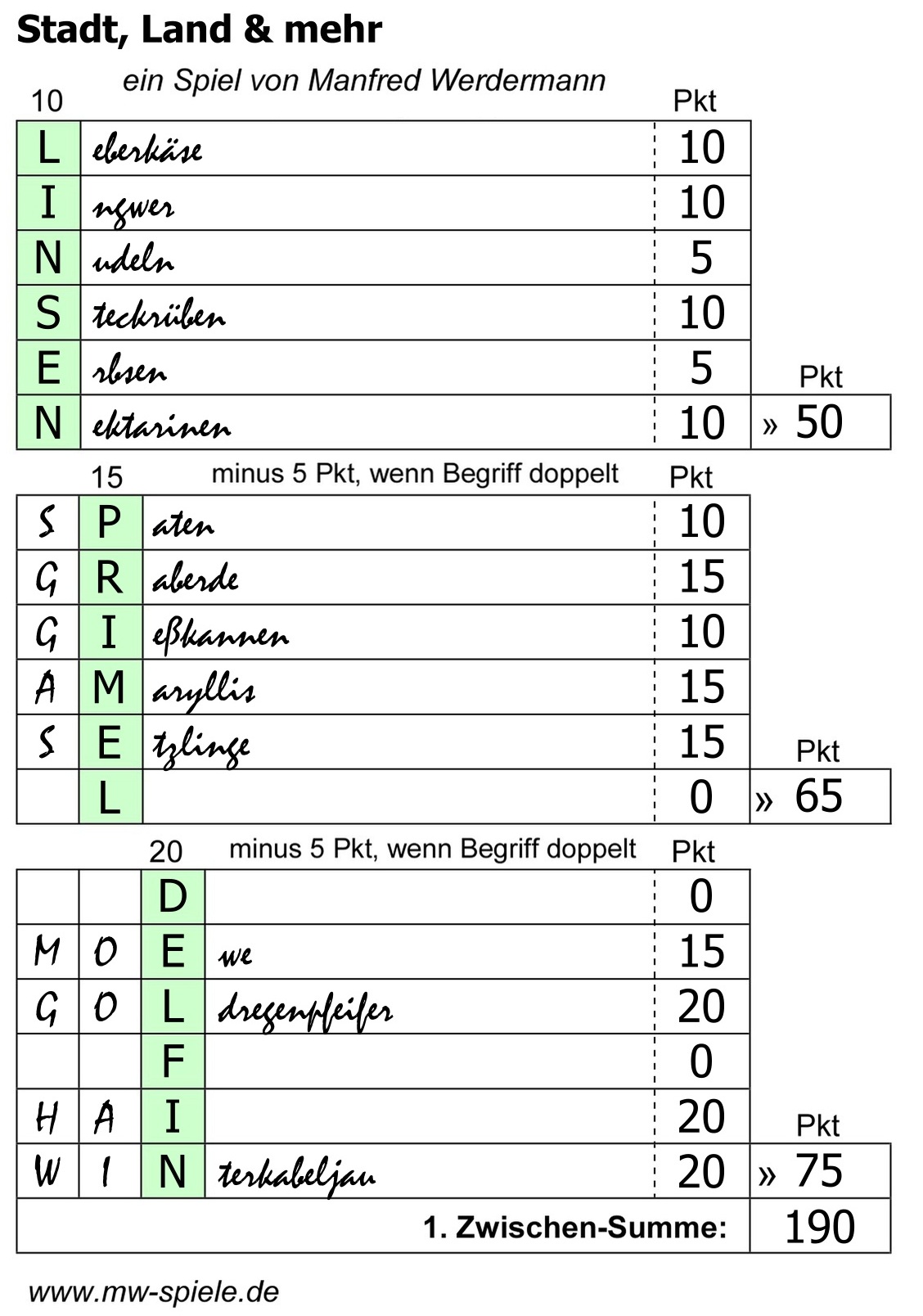 Stadt, Land & mehrein Spiel von Manfred WerdermannBei dieser anspruchsvollen Variante zum bekannten 'Stadt-Land-Fluss-Spiel' sind jeweils Begriffe einer Kategorie mit vorgegebenen, unterschiedlichen Buchstaben gesucht, wobei diese auch an der 2. bis 4. Stelle der Lösungswörter stehen können. Das Spielmaterial als pdf-Datei könnt ihr über den folgenden Link für den privaten oder pädagogischen Gebrauch öffnen, speichern und kostenlos nutzen. Spielmaterial zum Ausdrucken |