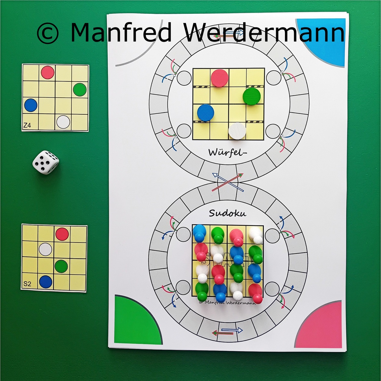Würfel-Sudokueine einzigartige Spiele-und-Rätsel-KombiWer schafft es als Erster, seine vier Spielfiguren vom Startsudoku aus in 'Mensch-ärgere-dich-nicht-Manier' an die richtigen Positionen des 4mal4-Farbsudokus in den Zielbereich zu bringen? Aber aufgepasst, denn die Spielfiguren der Mitspieler sind teils sehr 'entgegenkommend'. |